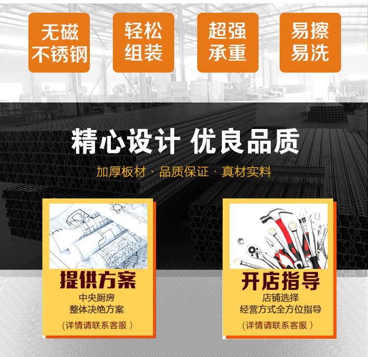江西眾得力廚具有限公司生產銷售商用廚具,食品機械,提供中央廚房工程項目整體解決方案。不銹鋼餐車有大號、中號、小號,本公司生產銷售的不銹鋼餐車系列均采用201無磁不銹鋼材質,板材厚度足0.8mm,整機拆裝方便,結構牢固,承重能力強。