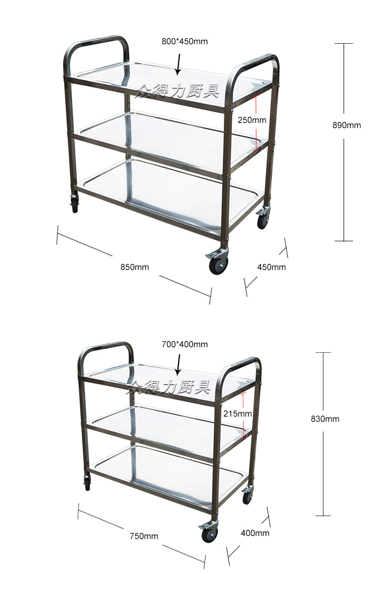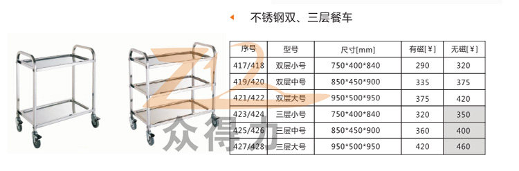 眾得力不銹鋼餐車系列價格及尺寸: